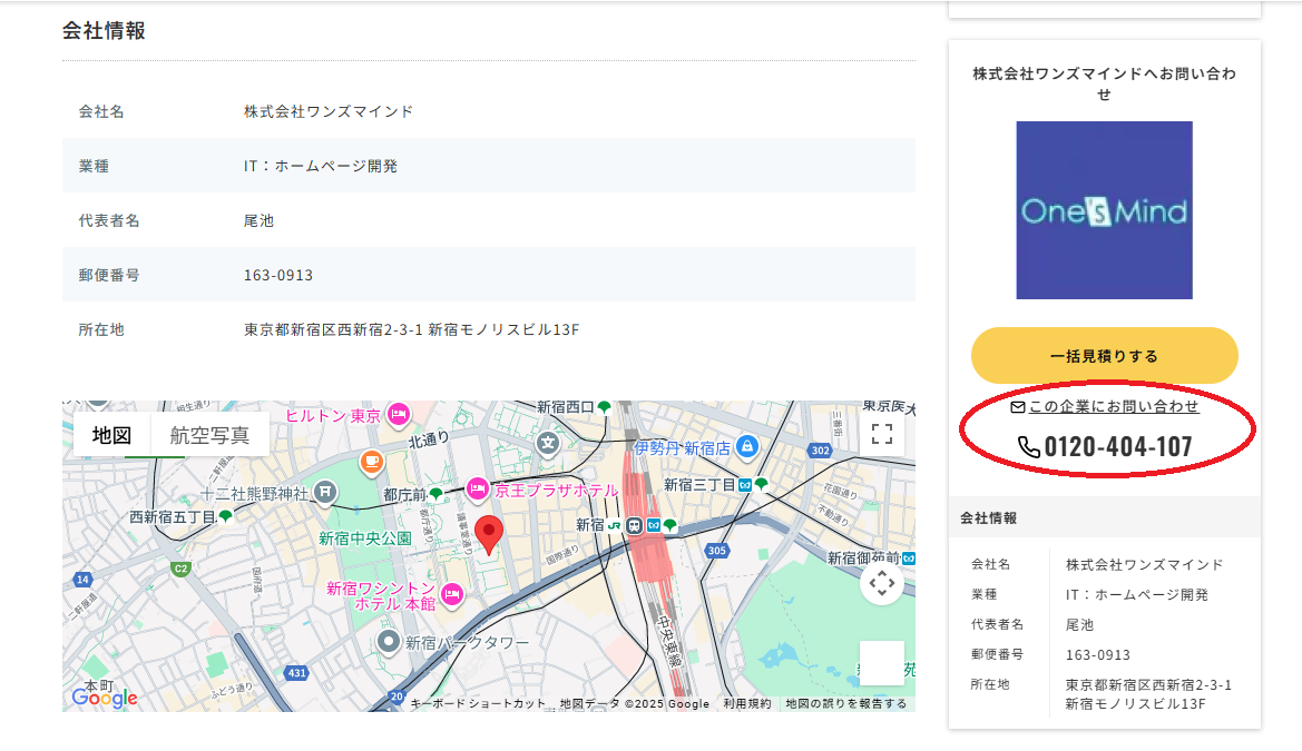貴社企業情報ページ内の下記2箇所に電話番号が表示されます。