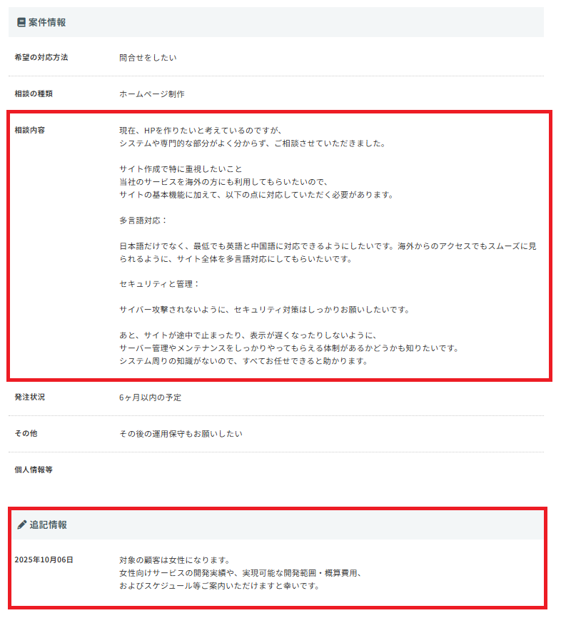 案件詳細及び案件の追記(一般公開)の画面 ※ 赤枠内に登場したキーワードにマッチした案件が配信されやすくなります ※ |