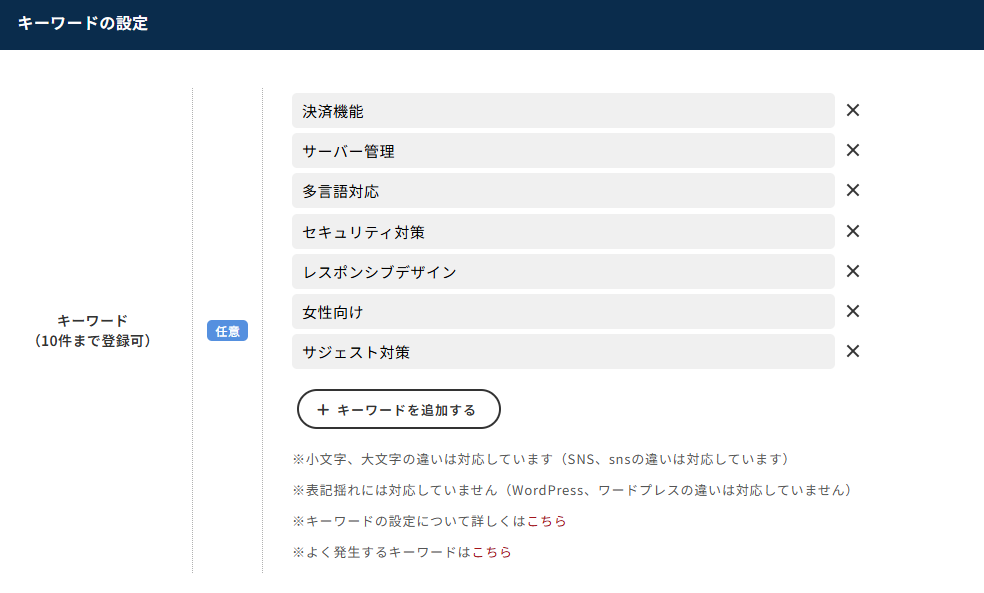 一般的なフレーズではなく、業務内容に直結するキーワードを登録することを推奨いたします。